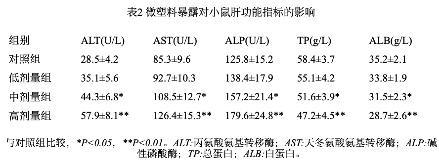 <0.05或P<0.01),提示微塑料暴露对肝细胞造成了一定程度的损伤。ALT和AST是肝细胞受损时释放到血液中的酶类,是评估肝脏损伤的重要指标。ALP主要由肝脏合成,在肝胆疾病时血清ALP水平会升高。因此,微塑料暴露导致小鼠血清中ALT、AST和ALP水平升高,表明其对肝细胞具有毒性作用。
